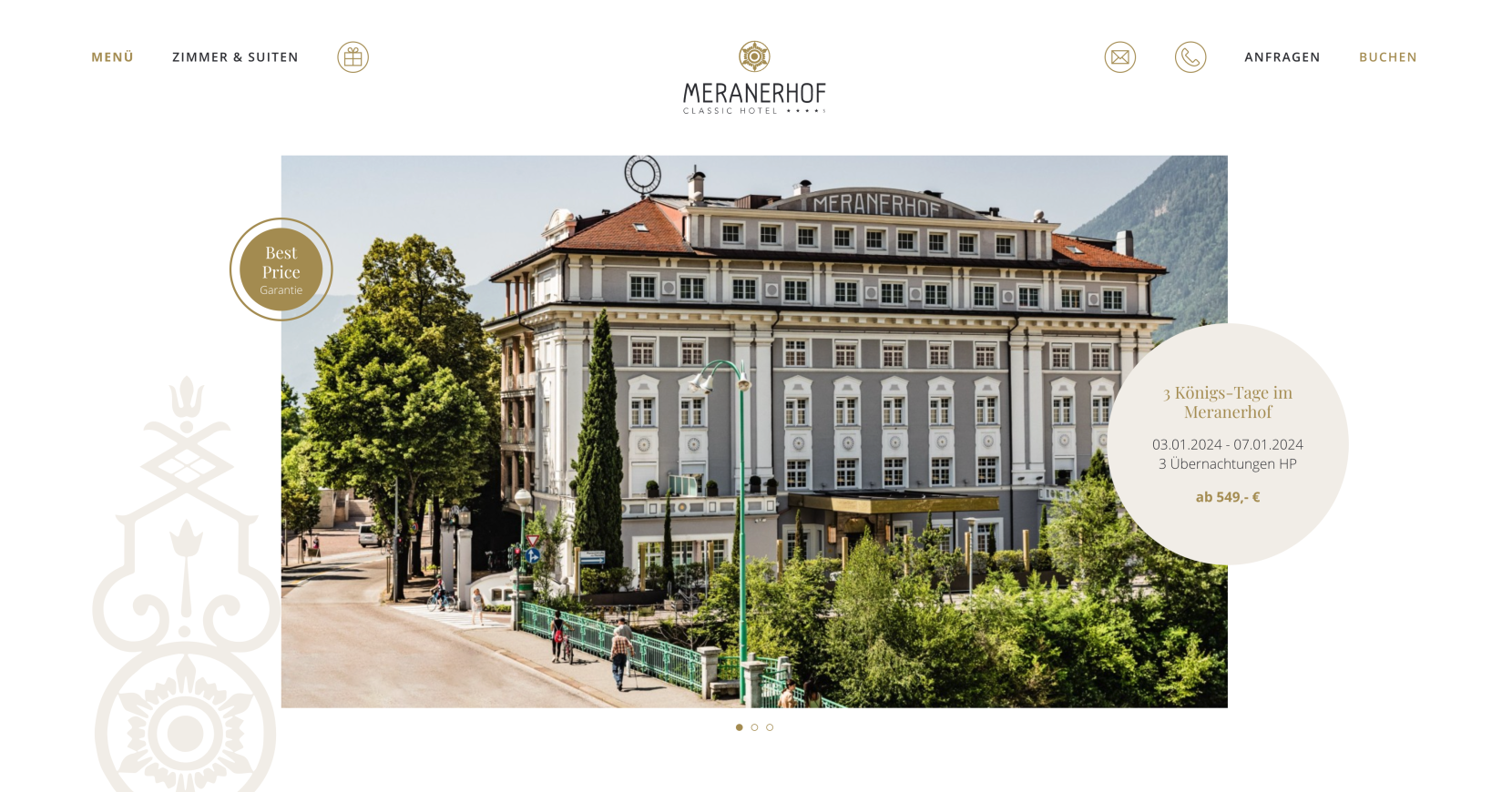 Direkt im Zentrum der Kurstadt Meran befindet sich das Classic Hotel Meranerhof. Ein eindrucksvolles Stadthotel, das kaum etwas von seinem ursprünglichen Jugendstil-Charme verloren hat. Für die Grand Dame, so wird das Hotel auch genannt, wurde gemeinsam mit AE Webdesign eine stilvolle, neue Website gestaltet.